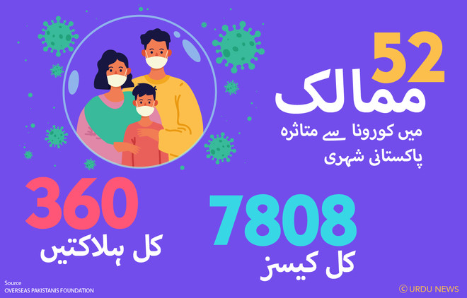 اوورسیز پاکستانیز فاؤنڈیشن (او پی ایف) کے اعداد و شمار کے مطابق دنیا کے 38 ممالک میں سات ہزار 808 پاکستانی کورونا کا شکار ہوئے اور 360 کی موت ہوئی، جبکہ واپس لائی گئی دیگر 646 میتوں کی وفات کی وجوہات کورونا کے علاوہ ہیں۔