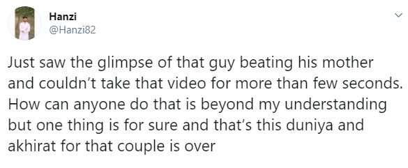 ٹوئٹر صارف ہنزی نے لکھا کہ ’اس ویڈیو جس میں بیٹا ماں کو مار رہا ہے میں اس ویڈیو کو چند سیکنڈ بھی نہیں دیکھ پایا میری سمجھ سے باہر ہے کہ آخر کوئی بیٹا ایسا کیسے کرسکتا ہے؟‘