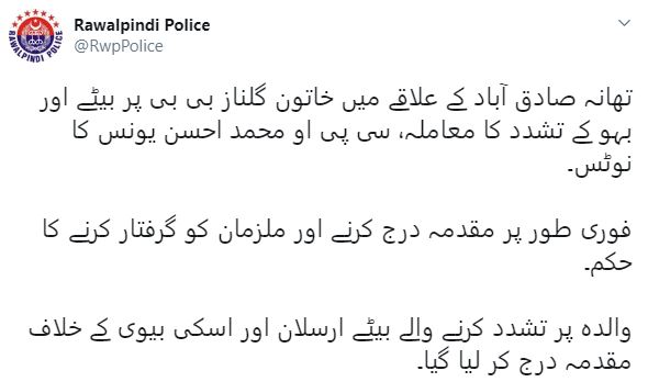 ویڈیو وائرل ہونے کے چند گھنٹوں بعد ہی سی پی او محمد احسن یونس نے واقعے کا نوٹس لے لیا۔ راولپنڈی پولیس کے ٹوئٹر اکاؤنٹ پر واقعے کے نوٹس کے حوالے سے ٹویٹ میں بتایا گیا کہ ’ تھانہ صادق آباد کے علاقے میں خاتون گلناز بی بی پر بیٹے اور بہو کے تشدد کا معاملہ، فوری طور پر مقدمہ درج کرنے اور ملزمان کو گرفتار کرنے کا حکم کر دیا گیا ہے اور والدہ پر تشدد کرنے والے بیٹے ارسلان اور اس کی بیوی کے خلاف مقدمہ درج کر لیا گیا۔