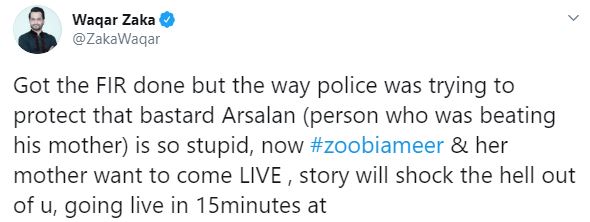 وقار ذکا نے لکھا ’بالاآخر ایف آئی آر ہوگئی لیکن پولیس اس شخص کو بچانے کی کوشش کر رہی ہے۔‘