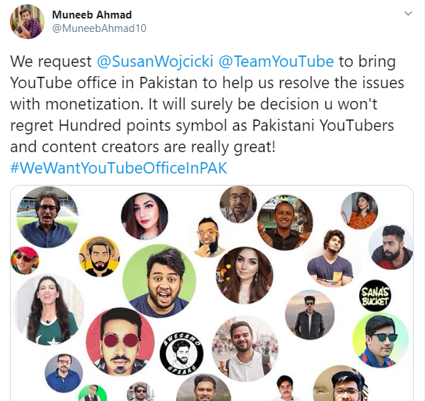 یوٹیوب سی ای او سوزن ووجیسکی کو مینشن کرتے ہوئے منیب احمد نامی صارف نے لکھا کہ ’پاکستان میں دفتر سے مونیٹائزیشن کا مسئلہ حل ہو گا۔ یہ ایسا فیصلہ ہو گا جس پر آپ کو افسوس نہیں ہو گا۔‘