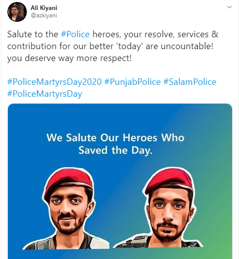 علی کیانی نامی صارف کچھ عرصہ قبل کراچی میں سٹاک ایکسچینج کی عمارت پر دہشت گرد حملے میں حملہ آوروں کو مارنے والے دو اہلکاروں خلیل اور رفیق کی تصویر والی ٹویٹ کے ساتھ گفتگو کا حصہ بنے تو لکھا ’سلام پولیس کو جو ہمارا آج اچھا بنانے کے لیے ان گنت کاوشیں کرتے ہیں، آپ کہیں زیادہ احترام کے لائق ہیں‘۔