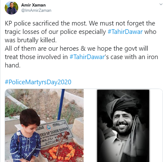 عامر زمان خیبرپختونخوا پولیس کے تذکرے کے ساتھ سامنے آئے تو لکھا ’کے پی پولیس نے سب سے زیادہ قربانیاں دی ہیں۔ ہم اپنی پولیس کے دل دکھا دینے والے نقصانات خصوصا بے دردی سے قتل کیے گئے طاہر داوڑ کو نہیں بھلا سکتے‘۔