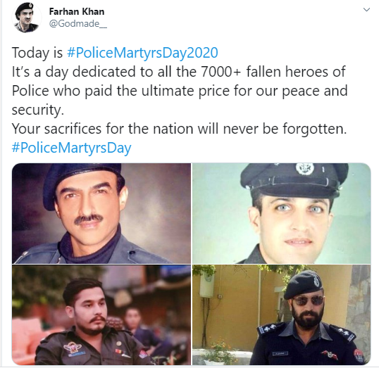 پولیس کی خدمات اور اصلاحات کے حوالے سے سوشل میڈیا پر خاصے ایکٹو رہنے والے فرحان خان نے بچھڑ جانے والوں کا تذکرہ کیا تو لکھا ’آج کا دن امن اور تحفظ کی خاطر جانوں کی قربانی دینے والے پولیس کے سات ہزار ہیروز کے نام ہے‘۔