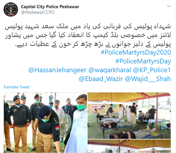 بڑے شہروں میں پولیس کے زیراہتمام خون کے عطیات کے لیے کیمپ بھی لگائے گئے۔ پشاور پولیس نے ایسی ہی سرگرمی کا انعقاد کیا تو اسے اپنے ٹوئٹر اکاؤنٹ پر شیئر بھی کیا۔