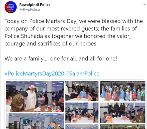 راولپنڈی پولیس نے آج کے دن کی مناسبت سے سرگرمی کی تو بچھڑ جانے والے اہلکاروں و افسران کے اہلخانہ کے اعزاز میں تقریب کا اہتمام کیا۔