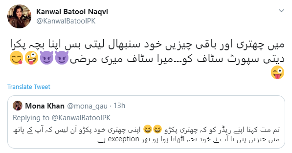 جواب میں کنول بتول نقوی کا کہنا تھا کہ ’میں چھتری اور باقی چیزیں خود سنبھال لیتی بس اپنا بچہ پکڑا دیتی ہوں سپورٹ سٹاف کو۔۔۔ میرا سٹاف میری مرضی‘۔
