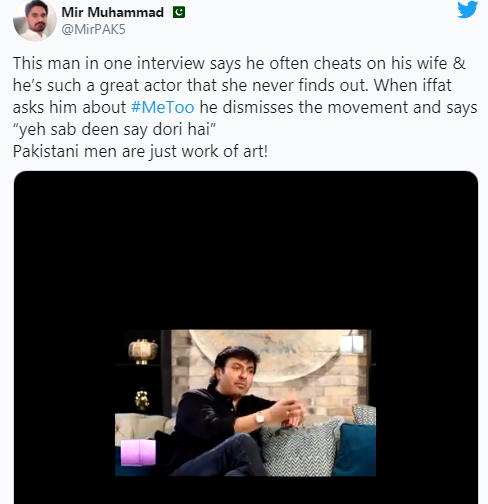 اس کی وجہ نعمان اعجاز کا وہ انٹرویو ہے جس میں وہ اداکارہ اور میزبان عفت عمر کو ایک طرف تو اپنے 'افیئرز' کے بارے میں بتا رہے ہیں اور دوسری طرف 'می ٹو مہم' کو 'دین سے دوری' کا نتیجہ قرار دے رہے ہیں۔