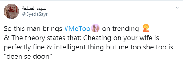 السیدہ المسلمہ کے نام سے ٹوئٹر ہینڈل نے لکھا کہ 'یہ شخص می ٹو کو ٹرینڈنگ پر لے آیا ہے اور ان کی تھیوری کے مطابق اپنی بیوی کو دھوکہ دینا بالکل ٹھیک اور عقل مندانہ کام ہے لیکن می ٹو شی ٹو دین سے دوری ہے۔'