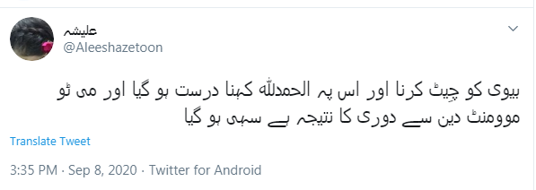 علیشہ نامی صارف نے لکھا کہ 'بیوی کو دھوکہ دینا اور اس پہ الحمدللہ کہنا درست ہو گیا اور می ٹو موومنٹ دین سے دوری کا نتیجہ ہے صحیح ہو گیا۔'