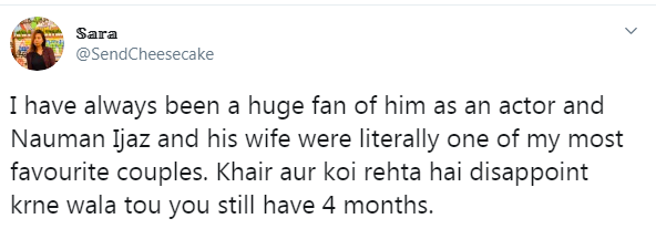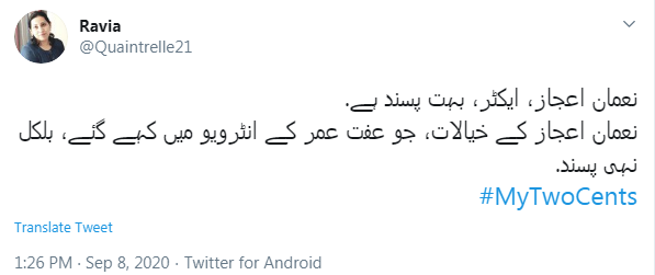راویہ کے نام سے ٹوئٹر صارف نے لکھا کہ 'نعمان اعجاز، ایکٹر، بہت پسند ہے. نعمان اعجاز کے خیالات، جو عفت عمر کے انٹرویو میں کہے گئے، بالکل نہیں پسند۔'