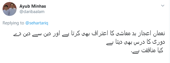 ایوب منہاس نامی صارف نے لکھا کہ 'نعمان اعجاز بد معاشی کا اعتراف بھی کرتے ہیں اور دین سے دین سے دوری کا درس بھی دیتے ہیں۔ کیا منافقت ہے۔'