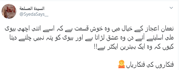السیدہ المسلمہ کے نام سے صارف نے لکھا کہ 'نعمان اعجاز کے خیال میں وہ خوش قسمت ہیں کہ انہیں اتنی اچھی بیوی ملی اس لیے آئے دن وہ عشق لڑاتے ہیں اور بیوی کو پتا نہیں چلنے دیتے کیونکہ وہ ایک بہترین اداکار ہیں۔ فنکاروں کی فنکاریاں۔'