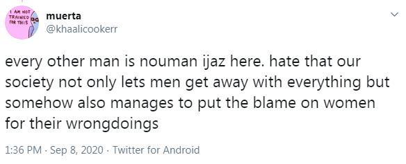 خالی کُوکر کے نام سے ٹوئٹر ہینڈل نے لکھا کہ 'یہاں ہر دوسرا مرد نعمان اعجاز ہے۔ اس بات سے نفرت ہے کہ ہمارا معاشرہ نہ صرف مردوں کو ہر معاملے سے بری الذمہ کر دیتا ہے بلکہ ان کے غلط کاموں کا الزام بھی خواتین پر لگاتا ہے۔'