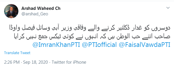 ارشد وحید چوہدری نامی صارف نے لکھا کہ 'دوسروں کو غدار ڈکلیئر کرنے والے وفاقی وزیر آبی وسائل فیصل واوڈا صاحب اتنے حب الوطن ہیں کہ انہوں نے کوئی ٹیکس جمع نہیں کرایا۔'
