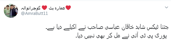عمارہ بٹ نامی ٹوئٹر صارف نے لکھا کہ 'جتنا ٹیکس شاہد خاقان عباسی صاحب نے اکیلے دیا ہے پوری پی ٹی آئی نے مل کر بھی نہیں دیا۔'
