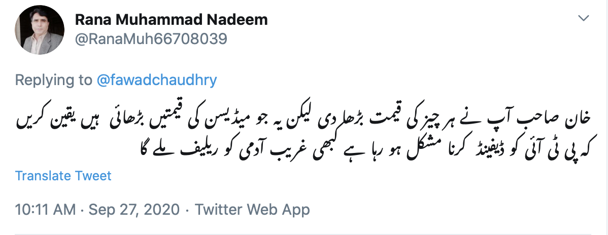 ایک اور ٹوئٹر صارف نے تحریک انصاف کے دور میں ہونے والی مہنگائی پر شکایت کرتے ہوئے کہا کہ حکومت کے ادویات کی قیمتیں بڑھانے کے حالیہ فیصلے کے بعد پی ٹی آئی کا دفاع کرنا مشکل ہو گیا ہے۔