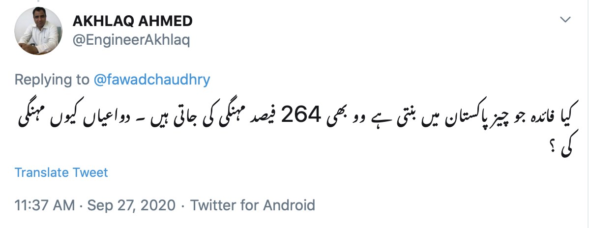 ٹوئٹر صارف محمد اشفاق نے وفاقی وزیر کی ٹویٹ پر تبصرہ کرتے ہوئے کہا کہ عوام کو ریلیف دینے کی غرض سے ادویات بھی درآمد کرنے کے بجائے مقامی طور پر تیار کی جائیں تاکہ قیمتوں میں کمی ممکن ہو۔ اس کے جواب میں ’نیا پاکستان‘ نامی صارف نے کہا کہ ادویات کی تیاری کے لیے پاکستان کو دو سے 3 ارب ڈالر کی سرمایہ کاری کی ضرورت ہے۔