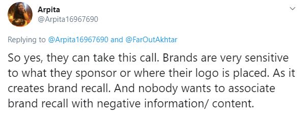ٹوئٹر صارف ارپیتہ نےلکھا کہ ’یہ صحیح ہے۔ یہ اس پر غور کر سکتے ہیں کیونکہ یہ بہت نازک معاملہ ہے کہ کون سا برانڈ کس کو سپانسر کررہا ہے اور ان کا لوگو اور کمپنی کا نام کس ادارے کے ساتھ استعمال ہوگا۔ اور کوئی ایسا نہیں چاہے گا کہ ان کا نام منفی پروپیگینڈے یا نفرت آمیز رپورٹنگ کرنے والے چینلز کے ساتھ جوڑا جائے۔‘