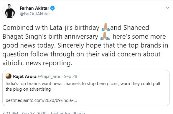 سماجی رابطے کی ویب سائٹ ٹوئٹر کے ایک صارف نے اس خبر کو شیئر کیا جس پر بات کرتے ہوئے انڈین اداکار فرحان اختر نے لکھا کہ ’لتا جی اور بھگت سنگھ کی سالگرہ کے دن کے ساتھ ساتھ یہ رہی ایک اور اچھی خبر، میں دل سے امید کرتا ہوں کہ مذکورہ اعلی برانڈز نفرت آمیز رپورٹنگ سے متعلق اپنی تشویش پر غور کریں گے۔‘