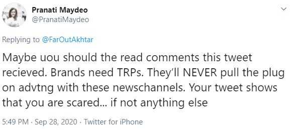اس حوالے سے ہونے والی بحث میں حصہ لینے والی صارف پرینیتی نے کہا کہ ’برانڈز کو ٹی آر پیز درکار ہوتے ہیں وہ اچانک کسی بھی نیوز چینل کو اشتہارات دینا کبھی بھی بند نہیں کریں گے لیکن آپ کی ٹویٹ سے لگتا ہے جیسے آپ ڈر گئے ہیں۔‘