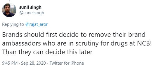 سنیل سنگھ کا کہنا تھا کہ ’اگر ایسی بات ہے تو سب سے پہلے برانڈز کو تمام ایسے سفیروں کو ہٹانا چاہیے جو منشیات کے کیسز میں ملوث ہیں یہ فیصلہ بعد میں بھی کیا جا سکتا ہے۔‘