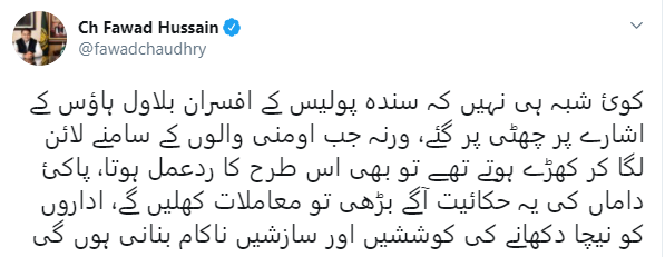 فواد چوہدری نے بدھ کی صبح مائکروبلاگنگ ویب سائٹ ٹوئٹر پر جاری کردہ بیان میں اس معاملے پر تبصرہ کیا تو لکھا کہ ’کوئی شبہ ہی نہیں کہ سندھ پولیس کے افسران بلاول ہاؤس کے اشارے پر چھٹی پر گئے، ورنہ جب اومنی والوں کے سامنے لائن لگا کر کھڑے ہوتے تھے تو بھی اس طرح کا ردعمل ہوتا، پاکی داماں کی یہ حکائت آگے بڑھی تو معاملات کھلیں گے، اداروں کو نیچا دکھانے کی کوششیں اور سازشیں ناکام بنانی ہوں گی‘۔