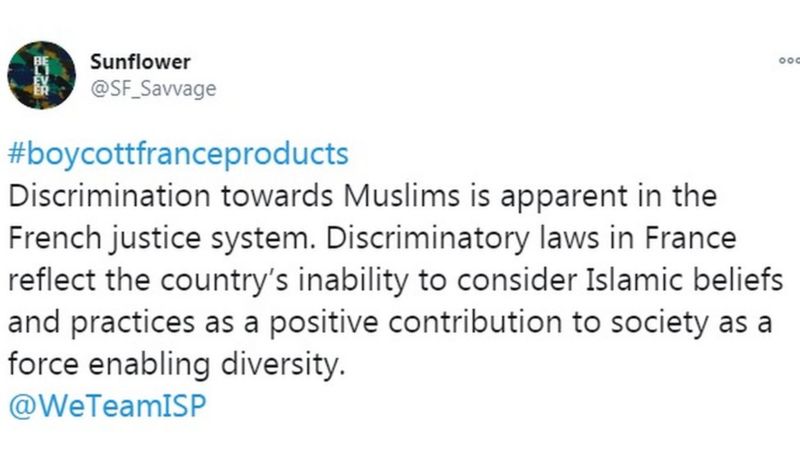 سن فلاور نامی ٹوئٹر ہینڈل سے لکھا گیا کہ ’فرانسیسی نظام عدل میں مسلمانوں کے ساتھ امتیازی سلوک واضح ہے۔‘