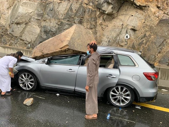 اخبار 24 کے مطابق طائف، الھدا روڈ پر بارش کے دوران وہاں سے گزرنے والی ایک گاڑی پر چٹان کا ایک ٹکڑا آگرا ۔ جس سے گاڑی کا اگلا حصہ تباہ ہوگیا۔ ڈرائیور معجزاتی طور پر بچ گیا۔