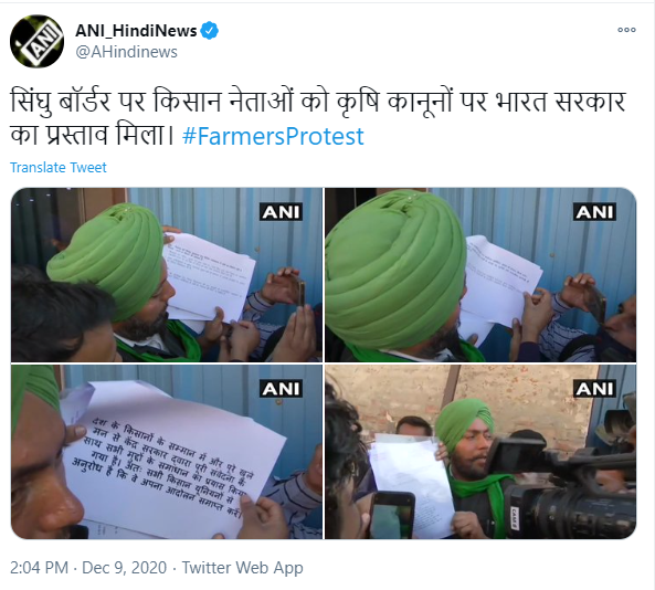 خبر رساں ادارے اے این آئی کے مطابق کسانوں کی تنظیموں نے کہا ہے کہ انھیں حکومت کی جانب سے تحریری تجاویز موصول ہوئی ہیں۔