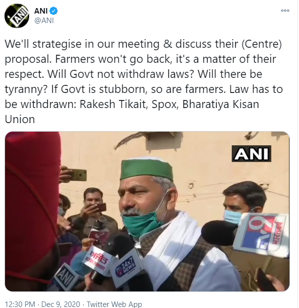بھارتیہ کسان یونین کے ترجمان راکیش ٹکیت کے بقول حکومت کی تجاویز کے بعد ہی کوئی بات واضح ہوگی۔ اے این آئی کے مطابق انھوں نے کہا کہ 'اب حکومت کے ساتھ چھٹے دور کی بات چیت نہیں ہوگی۔ حکومت چاہتی ہے کہ کسان سرکار کی پیشکش پر غور کرے۔ میٹنگ میں ہی ہم مستقبل کی حکمت عملی پر غور کریں گے۔‘