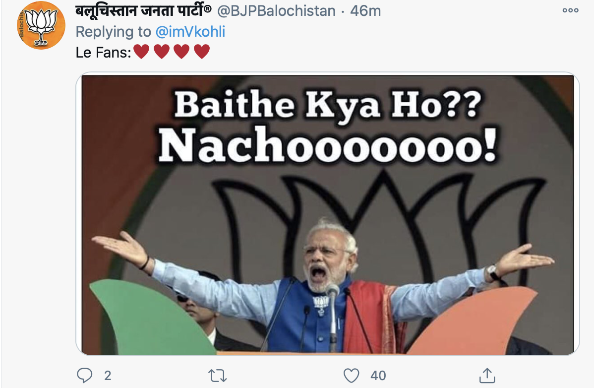 بی جے پی نامی ٹوئٹر صارف نے ویراٹ کوہلی کی ٹویٹ کے جواب میں وزیراعظم نریندر مودی کی تصویر پوسٹ کی جس پر لکھا ہوا تھا، بیٹھے کیوں ہو؟ ناچو!!