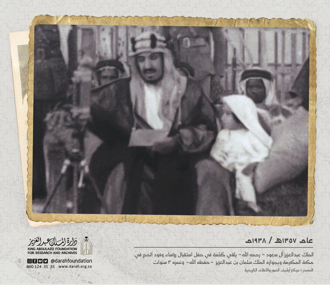 گذشتہ برس اگست میں سعودی عرب میں کنگ عبدالعزیز اکیڈمی نے 1357ھ مطابق 1938 کے دوران بانی مملکت شاہ عبدالعزیز آل سعود کی ایک نایاب تصویر کا کلپ جاری کیا تھا جس میں وہ مکہ مکرمہ میں حج وفود کے سربراہوں کے استقبا لیے سے خطاب کر رہے ہیں۔
