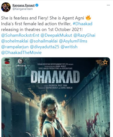 کنگنا رناوت نے اس فلم کے پوسٹر کے ساتھ ٹویٹ کی ہے کہ ’وہ بے خوف ہے، جوشیلی ہے۔ وہ ایجنٹ اگنی ہے۔‘ انڈیا کی خاتون کی سربراہی والی پہلی ایکشن تھریلر ’دھاکڑ‘ یکم اکتوبر 2021 کو ریلیز ہو رہی ہے۔‘