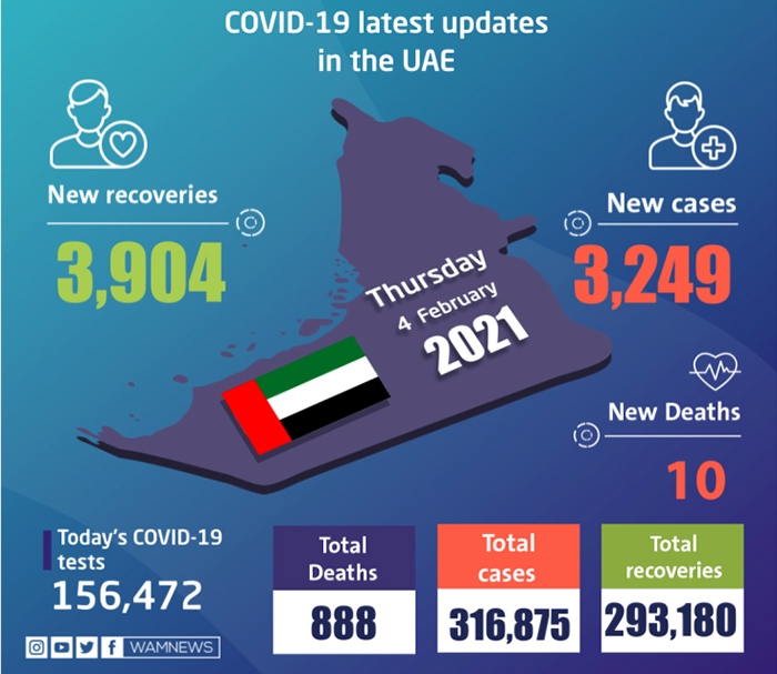 متحدہ عرب امارات کی وزارت صحت نے اعلامیہ جاری کیا ہے کہ جمعرات 4 فروری کو کووڈ 19 کے نئے کیسز 3249 ریکارڈ کیے گئے ہیں جبکہ 3904 افراد صحت یاب ہوئے ہیں- اسی طرح 10 افراد کی کورونا کے باعث موت واقع ہوئی ہے-