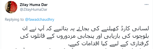 ظل ہما ڈار نامی ایک صارف نے وفاقی وزیر کو حکومت میں ہونے کی ذمہ داری یاد دلائی تو لکھا ’یہ بتائیے کہ آپ نے ان بلوچوں کی بازیابی اور پنجابی مزدوروں کے قاتلوں کی گرفتاری کے لیے کیا اقدامات کیے‘۔