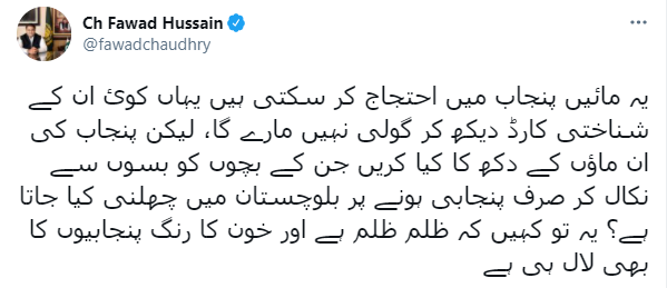 فواد چوہدری نے ٹویٹ میں کہا تھا کہ ’یہ مائیں پنجاب میں احتجاج کر سکتی ہیں یہاں کوئی ان کے شناختی کارڈ دیکھ کر گولی نہیں مارے گا۔‘