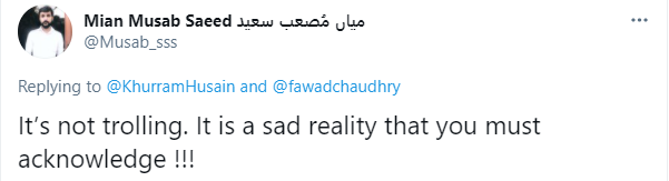 فواد چوہدری کے پیغام پر تنقید بڑھی اور کچھ یوزر نے اسے ناپسندیدہ ٹرولنگ قرار دیا تو تو کچھ دیگر صارفین ایسے بھی تھے جو وفاقی وزیر کے موقف کو ’تلخ سچائی‘ تسلیم کیے جانے کے خواہاں دکھائی دیے۔