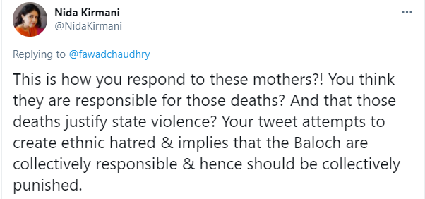 وفاقی وزیر کی جانب سے بلوچستان میں مزدوروں کے قتل کے واقعات کی جانب کیے گئے اشارے اور لاپتہ افراد کے لواحقین کو احتجاج کا حق دینے سے متعلق گفتگو کے انداز پر اعتراض کرتے ہوئے ندا کرمانی نامی ٹوئٹر صارف نے لکھا ’کیا یہ طریقہ ہے جس سے آپ ان ماؤں کو جواب دیں گے؟‘