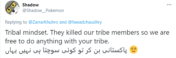فواد چوہدری کے موقف سے مکمل اتفاق نہ کرنے والے سوشل میڈیا یوزرز میں سے کچھ نے اس انداز فکر کو ’قبائلی مائنڈ سیٹ‘ کہا تو اپنے اس موقف کے پس پردہ وجہ بیان کرتے ہوئے لکھا ’پاکستانی بن کر تو کوئی سوچتا ہی نہیں یہاں‘۔