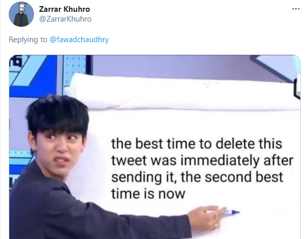 ٹیلی ویژن میزبان ضرار کھوڑو نے فواد چوہدری کے پیغام پر کیے گئے تبصرے میں انہیں’ٹویٹ ڈیلیٹ کرنے کے اوقات یاد دلائے۔‘