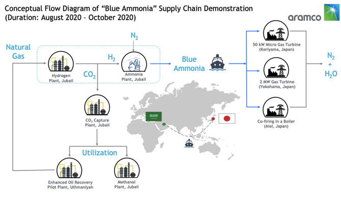 سعودی آرامکو اور سعودی بیسک انڈسٹریز کارپوریشن (سابک) نے 40 ٹن بلیو امونیا کی تیاری سے موجودہ انفراسٹرکچر کا فائدہ اٹھایا کیوںکہ بلیو امونیا سپلائی چین سعودی آرامکو تیل اور گیس کی پیداواری سہولتوں سے شروع ہوتی ہے جہاں ہائیڈروکاربنز بلیو امونیا میں پراسس کیے جاتے ہیں۔