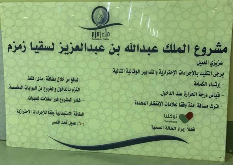 آب زمزم لینے کے لیے آنے والوں کو حفاظتی ماسک کی پابندی کرنا ہوگی۔ گیٹ پر درجہ حرارت چیک کیا جائے گا اور سماجی فاصلے کی بھی پابندی کرائی جائے گی۔