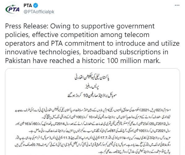 یاد رہے کہ پاکستان میں موبائل براڈبینڈ صارفین کی تعداد 10 کروڑ سے زائد ہو چکی ہے۔ 2012 میں صرف 20 لاکھ افراد موبائل براڈبینڈ استعمال کرتے تھے تاہم تھری جی متعارف کرائے جانے کے بعد گذشتہ برسوں میں یہ تعداد تیزی سے بڑھی ہے۔