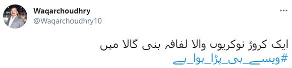ٹوئٹر صارف وقار چوہدری نے لکھا کہ ’ایک کڑوڑ نوکریوں والا لفافہ بھی اب تک ویسے ہی پڑا ہوا ہے۔‘