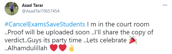 عدالتی فیصلے سے متعلق خوش امید کچھ ٹویپس نے ’پارٹی ٹائم ہے، آؤ خوشی منائیں‘ کا نعرہ لگایا تو ’امتحانات ملتوی کر کے طلبہ کو بچاؤ‘ کا ہیش ٹیگ سجانا بھی نہیں بھولے۔