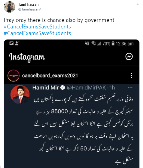 اسی دوران وزیرتعلیم شفقت محمود نے ایک ٹی وی انٹرویو میں طلبہ کی کثرت کے باعث ’میٹرک و انٹر کے امتحانات کو مشکل‘ مانا تو انسٹاگرام اور ٹوئٹر کے کچھ صارفین کو امید بندھی کہ شاید حکومت خود بھی التوا کا فیصلہ کر ڈالے۔