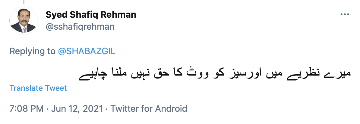 صارف سید شفیق الرحمٰان کا کہنا ہے کہ ’ میرے نظر میں اورسیز کو ووٹ کا حق نہیں ملنا چاہیے۔‘