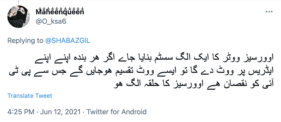 ووٹنگ کے نظام کو کے حوالے سے بات کرتے ہوئے ٹوئٹر ہینڈل ماہین لکھتی ہیں کہ ’اوورسیز ووٹر کا ایک الگ سسٹم بنایا جائے، اگر ہر بندہ اپنے اپنے ایڈریس پر ووٹ دے گا تو ایسے ووٹ تقسیم ہو جائیں گے جس سے پی ٹی آئی کو نقصان ہے، اوورسیز کا حلقہ الگ ہو۔‘