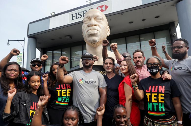 جارج فلائیڈ کے بھائی ٹیرنس فلائیڈ بروکلین میں جارج فلائیڈ کے مجسمے کی نقاب کشائی کے دوران اپنی مٹھی اٹھا کر سیاہ فاموں کے ساتھ اظہار یکجہتی کر رہے ہیں۔
